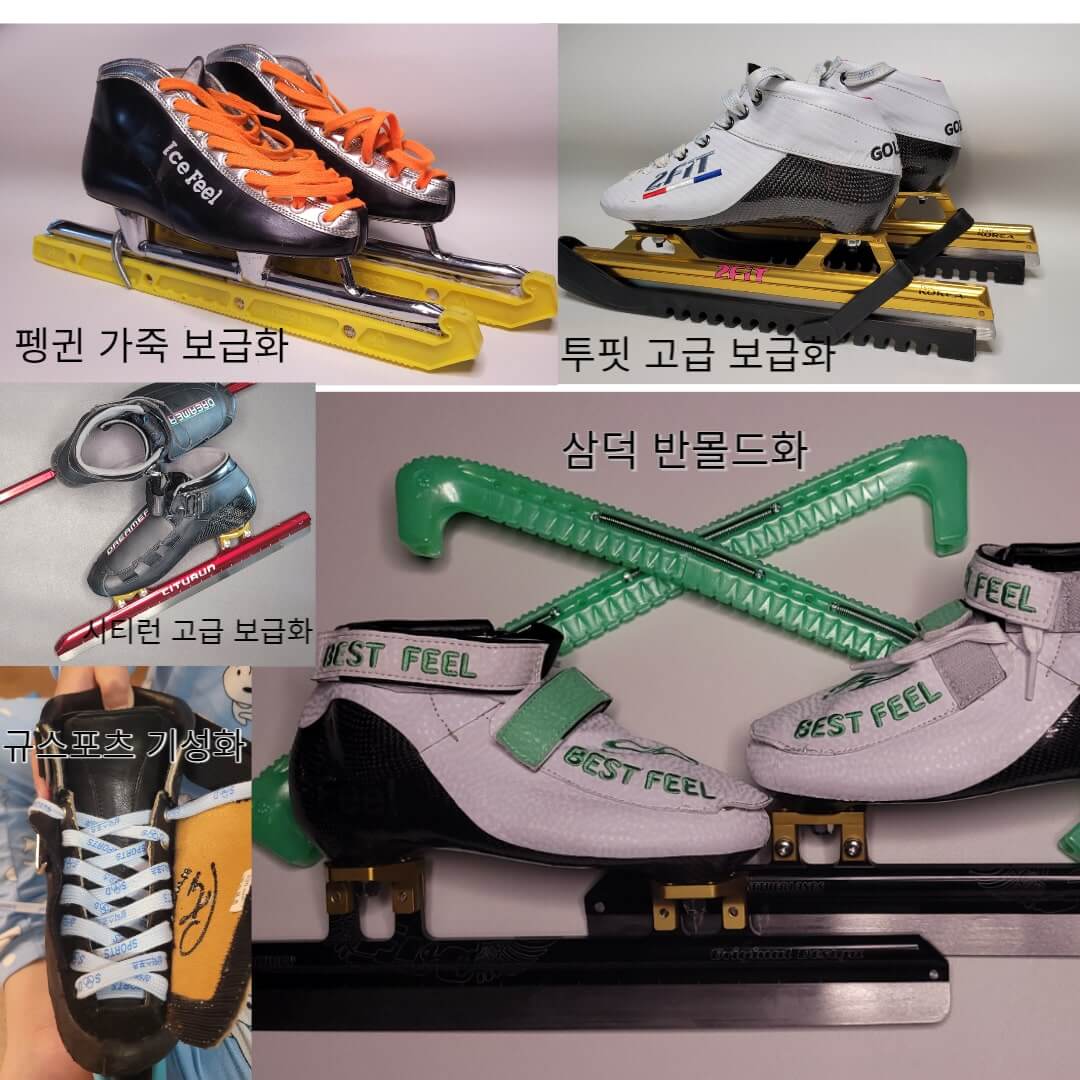 쇼트트랙 보급화는 크게 두 가지로 나누어 볼 수 있습니다. 부츠 전체가 인조가죽으로 되어 있어 발목을 단단히 지탱해 주지 못하지만 처음 스케이트를 배우는 사람에게는 가장 적합한 스케이트가 바로 가죽 보급화라고 할 수 있습니다. 질적인 면에서가 아닌 가격 측면에서 말이죠. 인조 가죽으로 만들어진 만큼 10만 원대의 가격으로 구매할 수 있으며, 얼마나 탈지 모르는 자녀에게 비싼 스케이트를 사주는 건 어려운 일인데 이때 가죽 보급화로 시작하면 좋습니다. 만약 코너링까지 흥미를 잃지 않고 타게 된다면, 그때부터는 본격적으로 쇼트트랙화를 알아보게 되는데요. 이때 고급 보급화라 불리는 스케이트화나 기성화 중 어떤 것을 선택해야 할지 갈등을 겪게 됩니다. 고급 보급화 회사로는 2 fit(투핏), bont, 삼덕, Evo(이보),citirun(시티런) 등이 있습니다. 투핏과 씨티런은 한국 회사인데 모두 OEM으로 중국과 베트남에서 생산되어 한국에서 판매되고 있습니다. 고급 보급화는 가격이 30만 원 안팎으로 가죽 보급화 보다 비싸지만 유리섬유에 경화제를 발라 가죽보다는 좀 더 단단해서 발을 적당히 잡아 줍니다. 고급 보급화를 구매할 경우 가죽 보급화 보다는 조금 더 오래 신을 수 있는데, 이 또한 전문 쇼트트랙화보다는 발목을 잘 잡아 주지 못하기 때문에 코너링 마스터 까지는 무탈하게 사용할 수 있지만 실력이 향상된다면 전용 쇼트트랙화를 알아보는 것이 좋습니다. 대부분 성인의 경우에는 사이즈 변동이 없기 때문에 가죽 보급화 보다 고급 보급화로 시작하는 경우가 많으며, 매 달 발 사이즈가 커지는 어린이들의 경우 가죽 보급화로 시작하여 기성화 반몰드화(중고)로 바꾸어 레벨업 하는 경우가 가장 흔합니다. 필자 또한 시티런 고급 보급화로 시작하여 코너링 마스터 하면서 1바퀴 활주를 자연스럽게 이어나갈 무렵, 반몰드화를 맞춘 사례에 해당합니다.