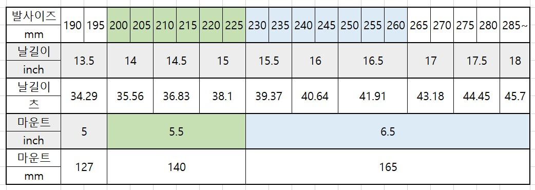 부츠 사이즈가 날길이 결정에 영향을 많이 주지만 체중과 신장 또한 날 길이 선택에 영향을 줍니다. 예를 들어 초등학교 3학년 인 학생과 40세인 엄마의 발 사이즈가 230mm로 동일하다고 했을 때, 블레이드의 길이는 다르게 선택해야 합니다. 체중이 적게 나가고 키가 작은 초3 아이는 15.5인치가 적당하고 아들보다 체중과 신장이 큰 엄마는 16인치를 선택해야 합니다. 엄마가 15.5인치 날을 사용할 경우 본인의 체중을 실어 밀 수 있는 힘이 적어지므로 빠른 속도를 낼 수가 없기 때문입니다. 마치 중형차에 경차 타이어를 체결한 것과 같이 말이죠. 크로스 오버 기술이 어렵고 미숙한 초급자는 큰 영향을 주지 않지만 실력이 향상될수록 이 차이는 크게 느껴질 수 있습니다. 그렇기 때문에 처음부터 체중과 신장 발 사이즈를 모두 고려하여 본인에게 딱 맞는 블레이드를 사용하는 것을 추천합니다.